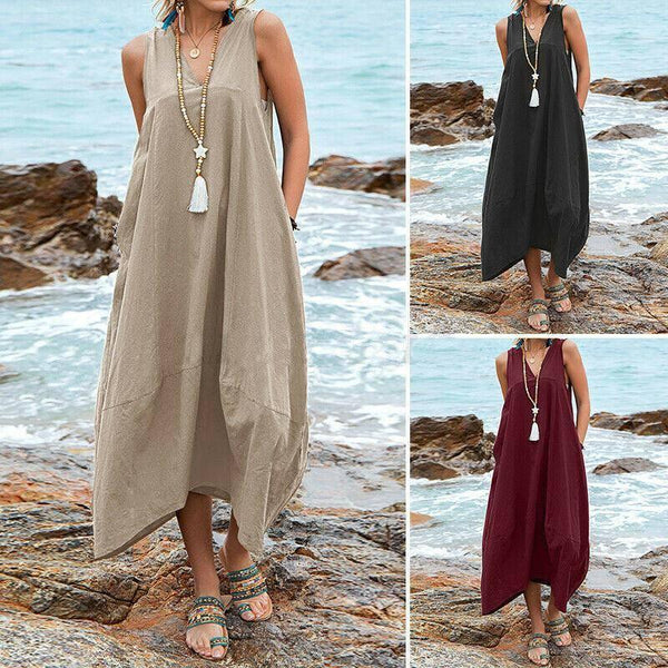 レディース・コットン&リネン・Vネック・ポケット・カジュアル・ドレス