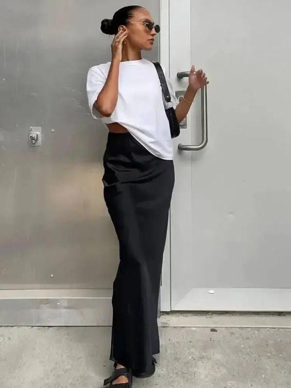 女性の黒のエレガントなサテンファッションスリムスカート四季