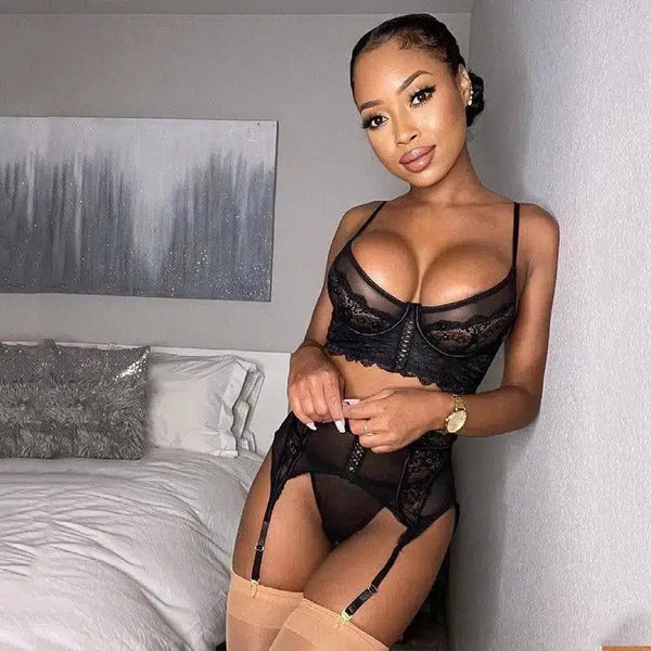 女性用レースアイラッシュステッチスリングランジェリー スリーピース