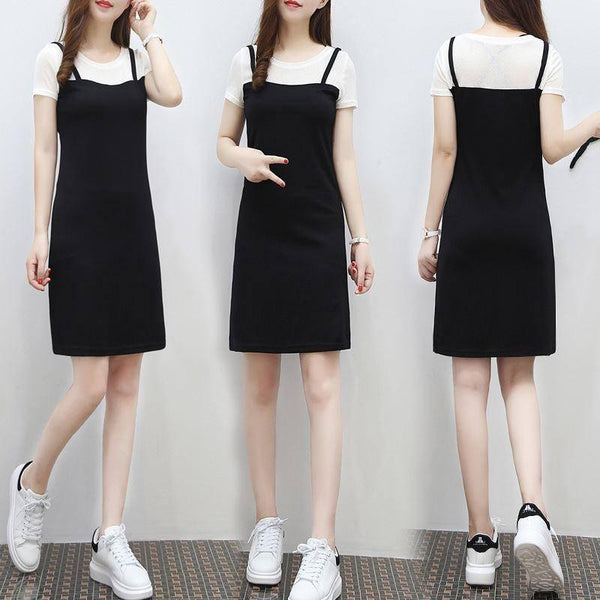 半袖ミッドロングフェイクツーピースサスペンダードレス夏