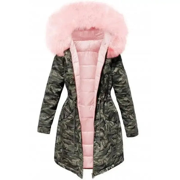 ぬいぐるみ厚手コートゆったりビッグファー襟ミッド丈迷彩