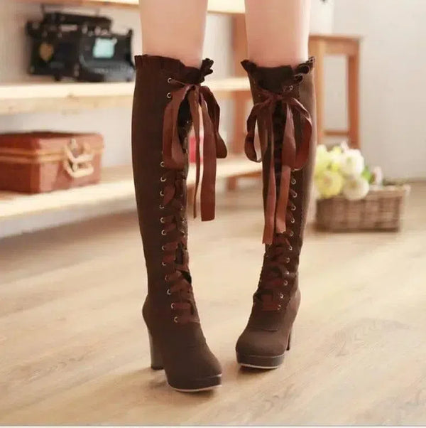 商品の説明:女性用ベルベットストラップハイヒールトールブーツ