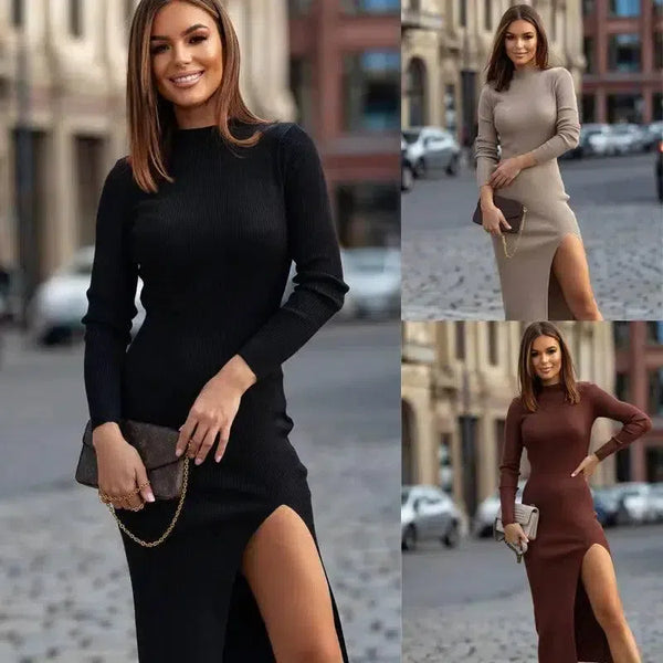 秋と冬のドレスラウンドネックスリムカラーソリッド