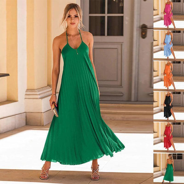 ファッションAラインプリーツサスペンダーロングワンピースサマーカジュアル