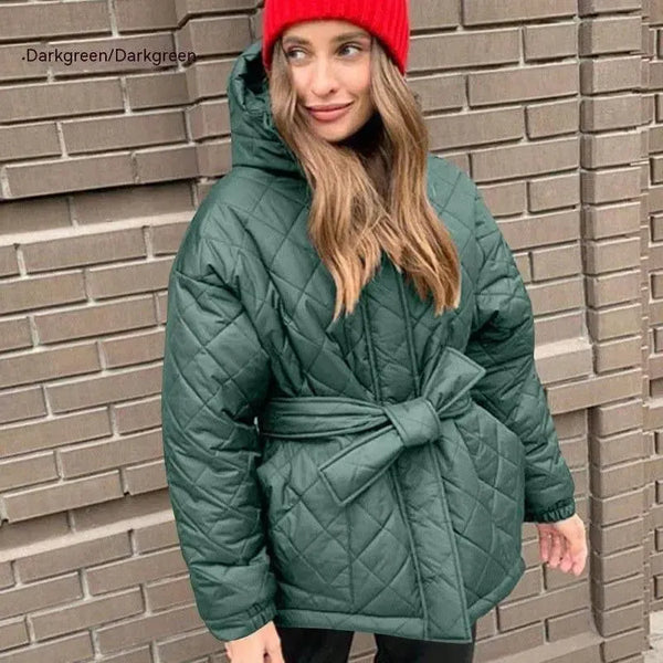 フード付き中綿ジャケット スリムフィット レースアップ ラペル 長袖