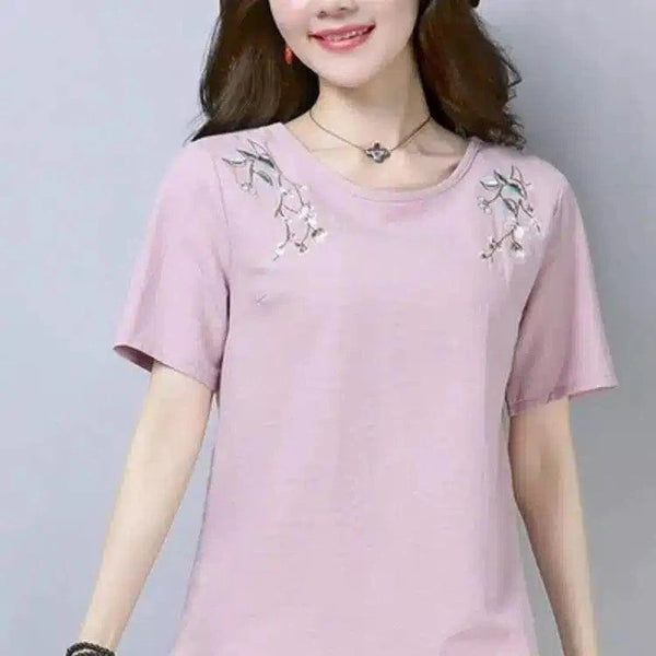 - 衣服の種類:女性用Tシャツ 袖丈:半袖 ネックライン:ラウンドネックライン フィット感:リラックスフィット デザイン・ディテール:ショルダー部分に刺繍された花のアクセント